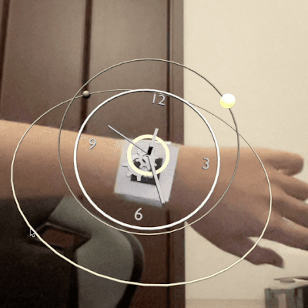 マーカーをカメラに読み込ませることでARで時計を表示します。p5.jsで作成しました。実際の時刻を表示できます。また歯車が回る簡易的なアニメーションもあります。